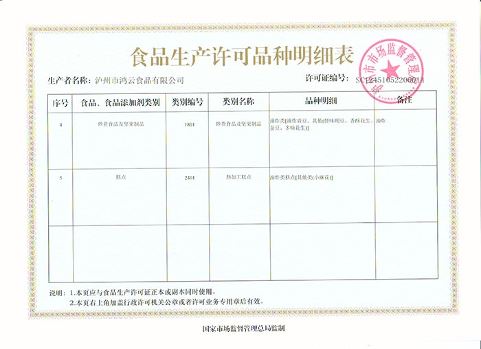 食品安全許可證明細表